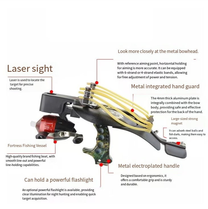 O arco de pesca a laser War Wolf é engenhosamente projetado e altamente funcional. Ele utiliza tecnologia avançada de mira a laser, garantindo que cada disparo seja preciso e exato. Seja peixe parado ou presa em movimento, nenhum escapa do seu "olho". Além disso, ele é equipado com um escudo protetor metálico, que não é apenas resistente e durável, mas também protege efetivamente suas mãos, permitindo que você aproveite o prazer da pesca sem se preocupar com possíveis riscos à segurança.