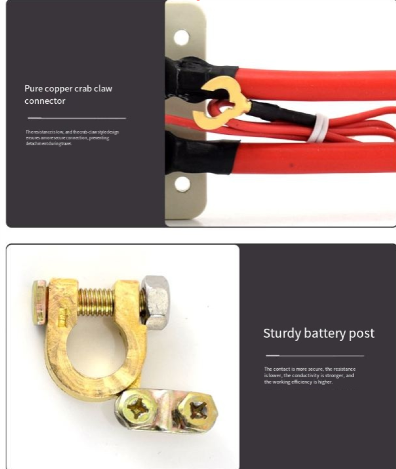 O design detalhado mostra profissionalismo: com um design de transporte de corrente grande, a corrente estável pode chegar a 200A, atendendo aos requisitos de fonte de alimentação de equipamentos de veículos de grande capacidade; Possui proteção anti-vazamento elétrico, evitando efetivamente a perda de energia e os riscos de segurança causados pelo vazamento da bateria; O processo de instalação é simples e rápido, não exigindo conhecimento profissional, e você mesmo pode concluir a operação, economizando tempo e dinheiro.