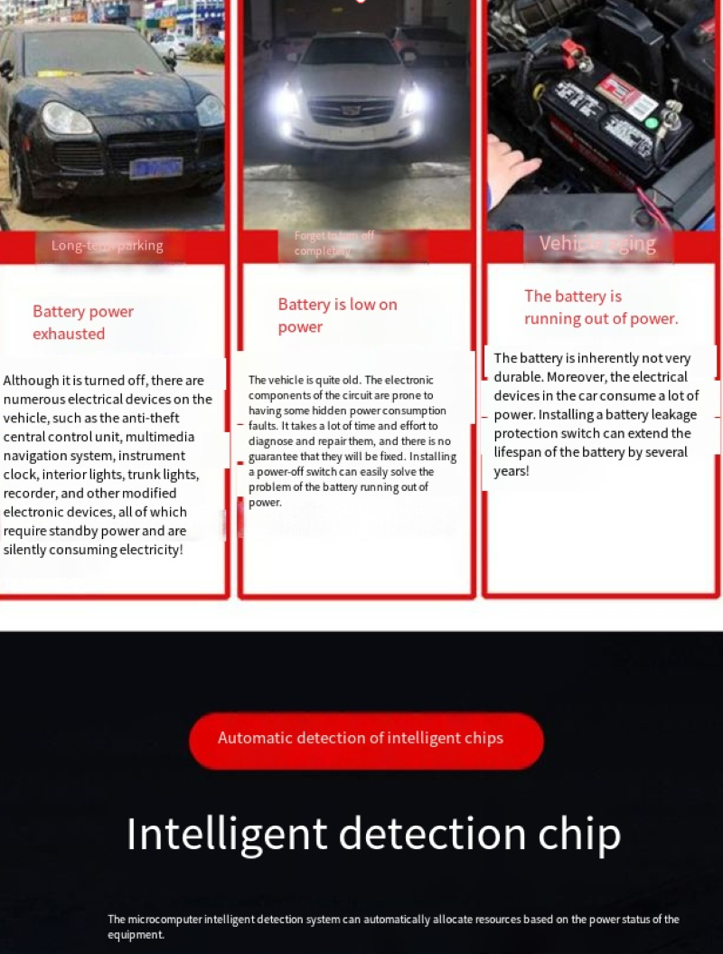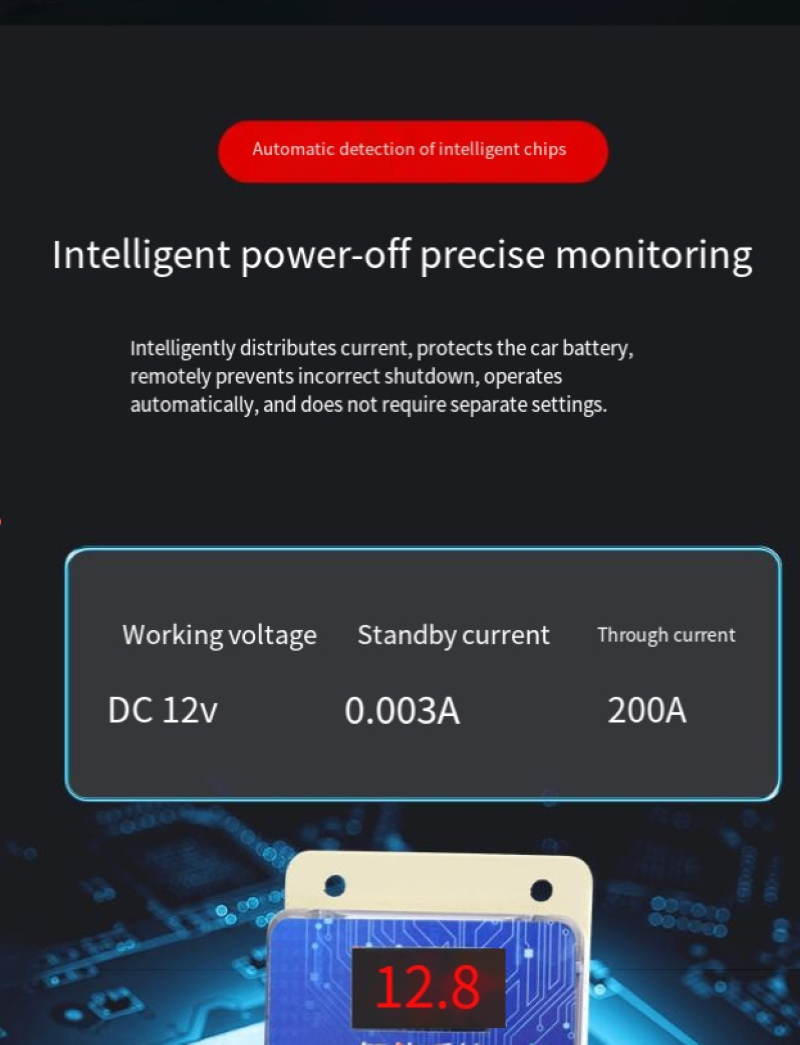 Sua tecnologia de corte de energia inteligente aborda diretamente os pontos problemáticos do uso do veículo: equipado com um sistema de corte automático de energia de baixa tensão, ele monitora continuamente a tensão da bateria. Quando a tensão cai abaixo do valor crítico, ele corta automaticamente a fonte de alimentação, evitando fundamentalmente o problema da incapacidade do veículo de dar partida devido ao esgotamento da bateria; Ao mesmo tempo, possui uma função de detecção inteligente, permitindo que você sempre acompanhe o status da bateria sem operações complexas, dando a você uma compreensão clara da situação de energia do seu carro.