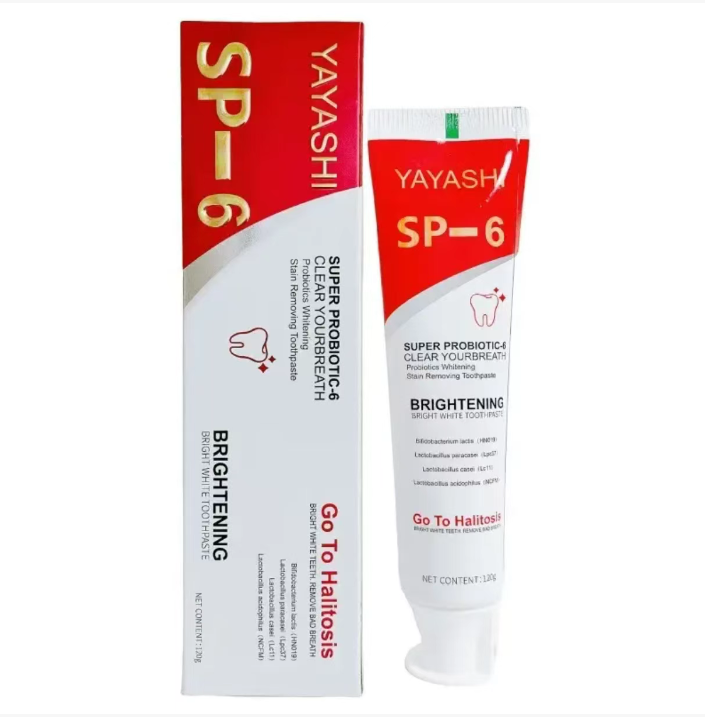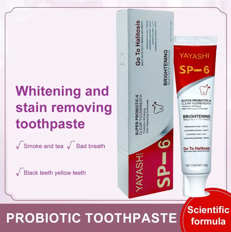 YAYASHI SP - 6 Pasta Probiótica para Clareamento e Remoção de Manchas combina o cuidado saudável dos probióticos com poderosos efeitos de clareamento e remoção de manchas, trazendo uma atualização completa do clareamento dental para a saúde bucal. Diga adeus aos problemas de manchas e mau hálito, e tenha um sorriso confiante. Comece a escolher a partir de agora.