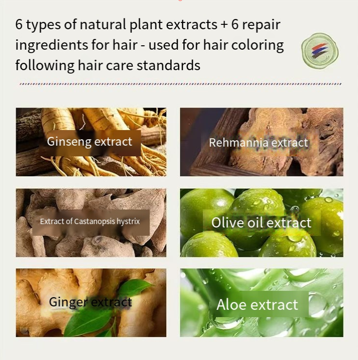 O principal charme dessa tintura está em sua fórmula natural de plantas. Seleciona cuidadosamente seis tipos de essências naturais de plantas, incluindo extrato de ginseng, extrato de rehmannia, extrato de Castanopsis hystrix, extrato de azeite, extrato de gengibre e extrato de aloe. Esses componentes vegetais não só têm excelentes efeitos de tingimento capilar, mas também proporcionam nutrição e reparo completos ao cabelo durante o processo de tingimento. O extrato de ginseng é rico em vários nutrientes e pode penetrar nos fios de cabelo, aumentando a dureza e elasticidade do cabelo; O extrato de Rehmannia ajuda a melhorar o ressecamento do cabelo, deixando-o mais liso e brilhante; o extrato de Castanopsis hystrix tem uma função reparadora única e pode reparar efetivamente a qualidade do cabelo danificado; O extrato de azeite é um hidratante natural, repondo a umidade do cabelo e prevenindo a perda de umidade; O extrato de gengibre pode promover a circulação sanguínea no couro cabeludo, proporcionando um ambiente favorável ao crescimento capilar; O extrato de aloe tem um efeito calmante e pode aliviar a irritação no couro cabeludo causada pela tintura do cabelo.