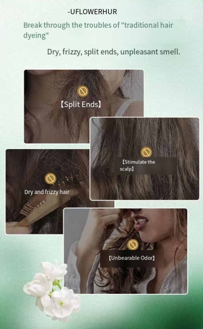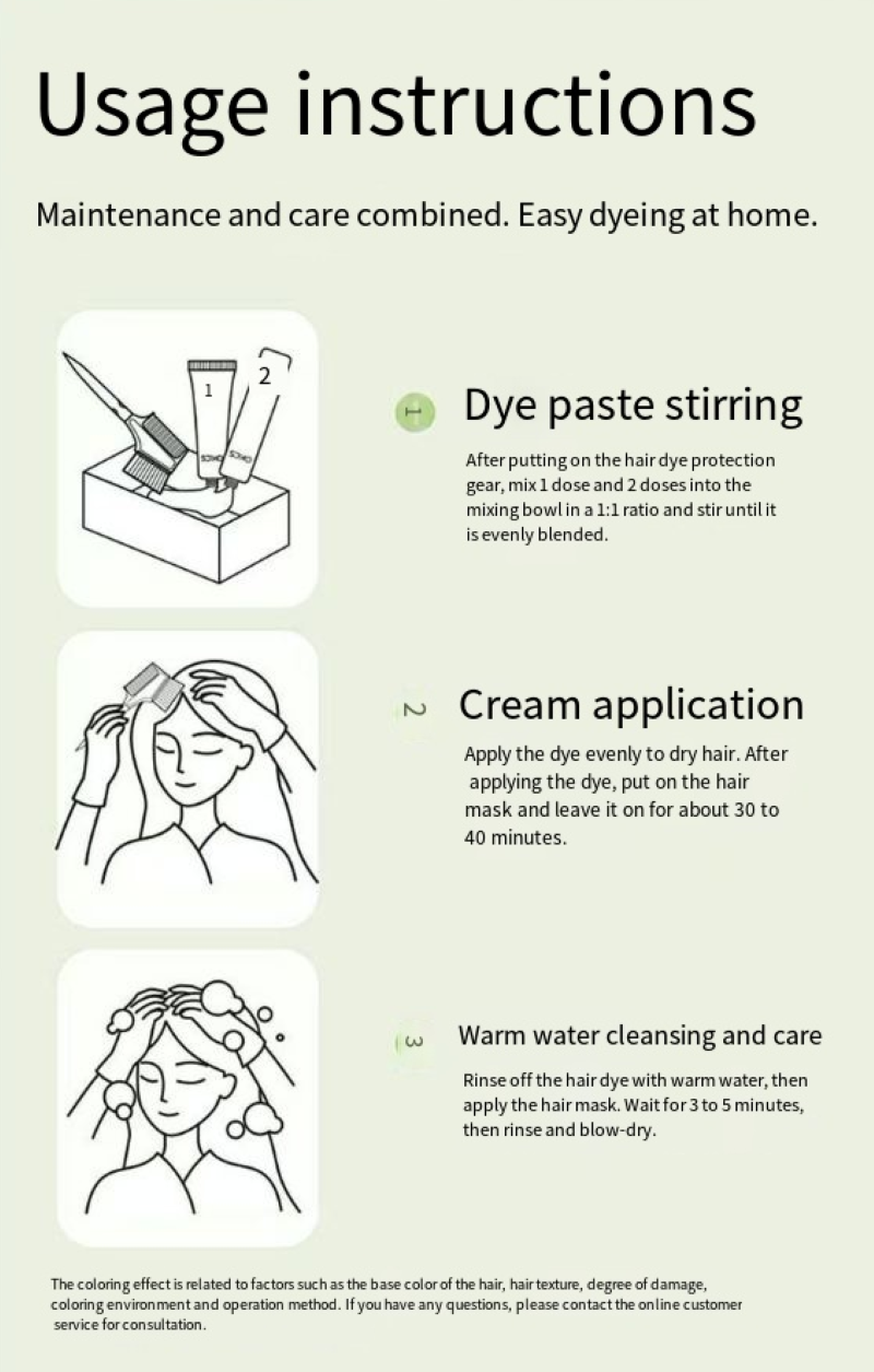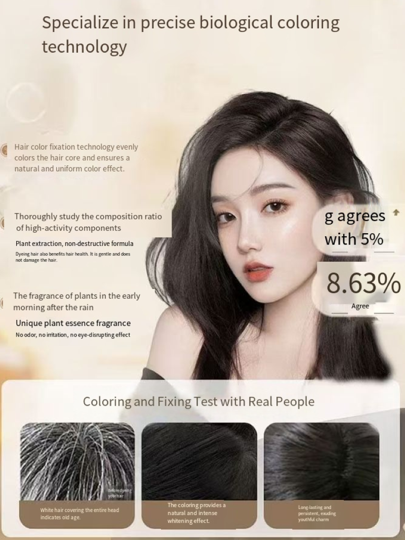 Diferente dos produtos comuns de tintura para cabelo, este permite tingimento e nutrição simultâneos. Durante o processo de tingimento, a essência vegetal nutre continuamente o cabelo e repara a qualidade danificada causada pela tintura. Após a tintura, o cabelo não só fica com uma cor rica, mas também fica mais macio, brilhante e com um toque suave. Você não precisa mais se preocupar que tingir vai deixar seu cabelo seco e propenso a quebrar, porque esse produto não só proporciona uma linda coloração, mas também cuida secretamente da saúde do seu cabelo.