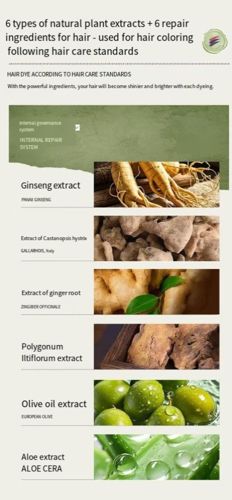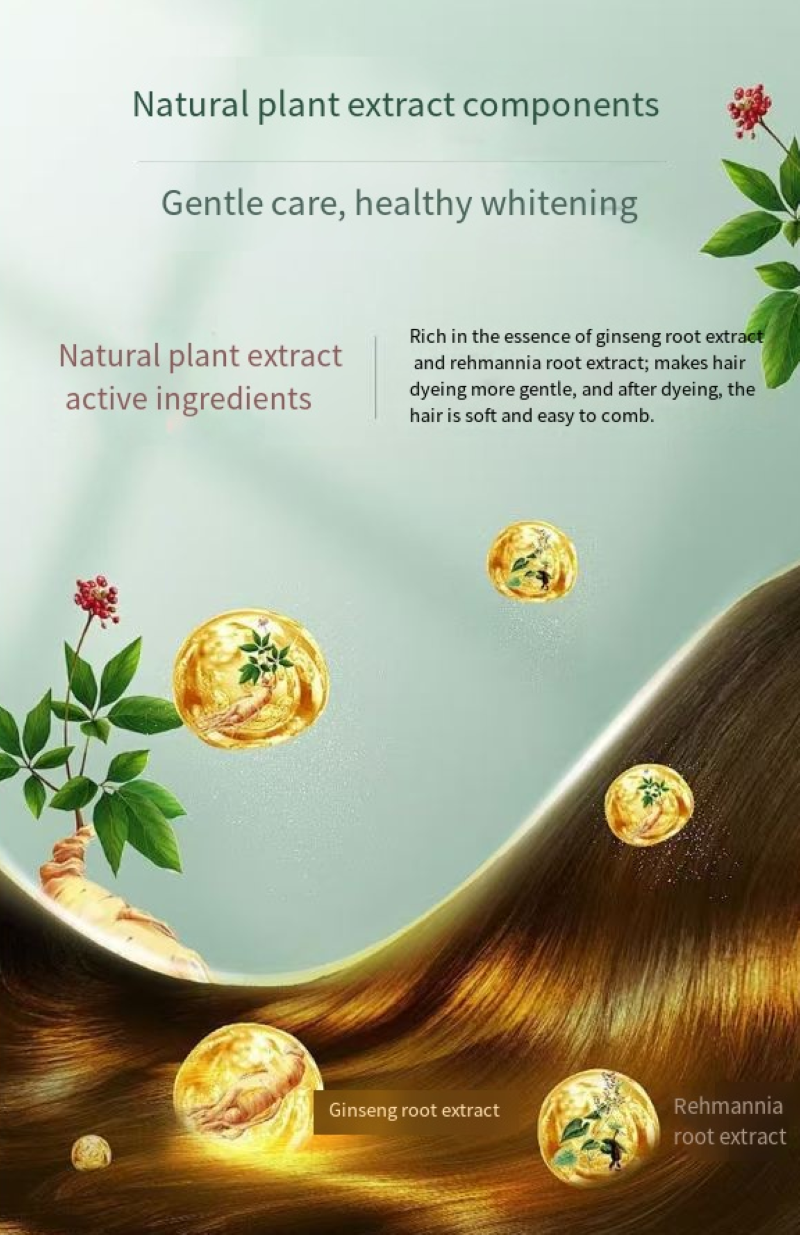 O principal charme dessa tintura está em sua fórmula natural de plantas. Seleciona cuidadosamente seis tipos de essências naturais de plantas, incluindo extrato de ginseng, extrato de rehmannia, extrato de Castanopsis hystrix, extrato de azeite, extrato de gengibre e extrato de aloe. Esses ingredientes vegetais não só têm excelentes efeitos de tingimento capilar, como também proporcionam nutrição e reparo completos durante o processo de tingimento. O extrato de ginseng é rico em vários nutrientes e pode penetrar nos fios do cabelo para aumentar a dureza e elasticidade do cabelo; o extrato de rehmannia ajuda a melhorar o ressecamento do cabelo, tornando-o mais liso e brilhante; o extrato de Castanopsis hystrix tem uma função reparadora única e pode reparar efetivamente a qualidade danificada do cabelo; o extrato de azeite é um hidratante natural, repor a umidade do cabelo e prevenir a perda de umidade; o extrato de gengibre pode promover a circulação sanguínea no couro cabeludo, proporcionando um ambiente favorável ao crescimento capilar; o extrato de aloe tem um efeito calmante e pode aliviar a irritação causada pela tintura do cabelo.