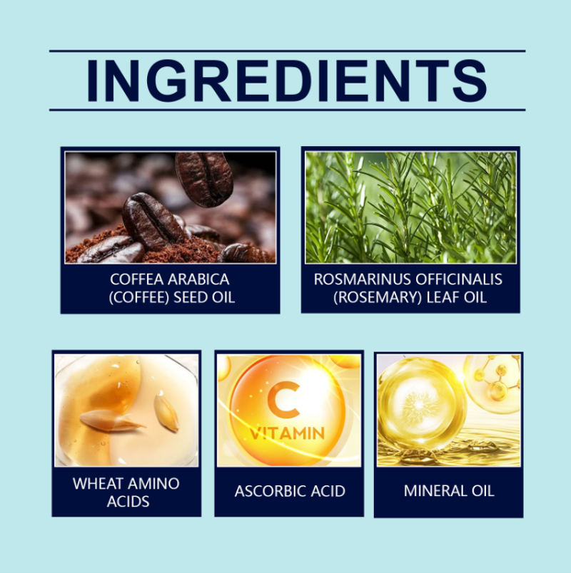 O spray para crescimento capilar contém café, minerais, vitaminas e aminoácidos. Um spray leve pode nutrir profundamente os fios do cabelo – ele repara os danos causados por permanentes e colorações, reduz quebras, além de suavizar o frizz e dar brilho, deixando o cabelo forte e brilhante. Tem uma textura refrescante e não oleosa, e é fácil de usar a qualquer momento com apenas um leve spray. Não depende de uma camada grossa de óleo de silicone para suavidade. O núcleo de sua composição é uma combinação de ingredientes "suaves para nutrição capilar":