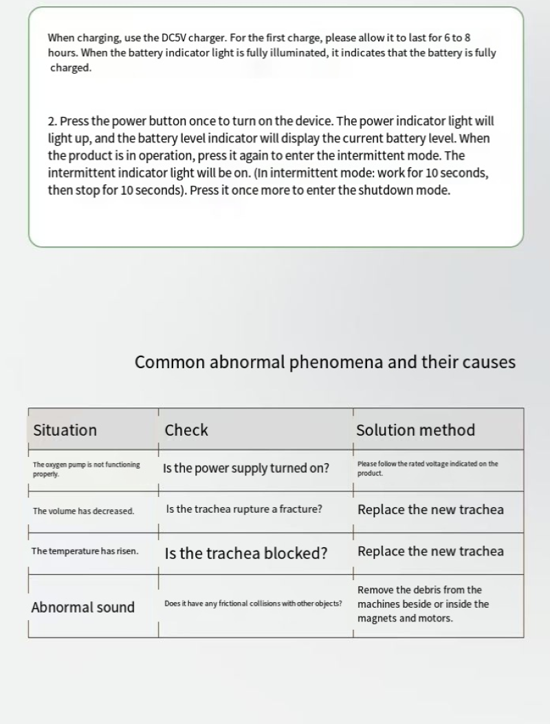 Em termos de operação, essa bomba de oxigênio também é muito simples. Ele possui um painel de controle intuitivo de botões, permitindo ligá-lo e desligá-lo com apenas um clique, além de uma luz indicadora de nível de bateria e uma função de ajuste de fluxo. Isso permite que você acompanhe o estado de funcionamento da bomba de oxigênio a qualquer momento e ajuste a saída de oxigênio conforme necessário. Seja você iniciante ou um usuário experiente, pode começar facilmente e aproveitar a conveniência proporcionada pela tecnologia.