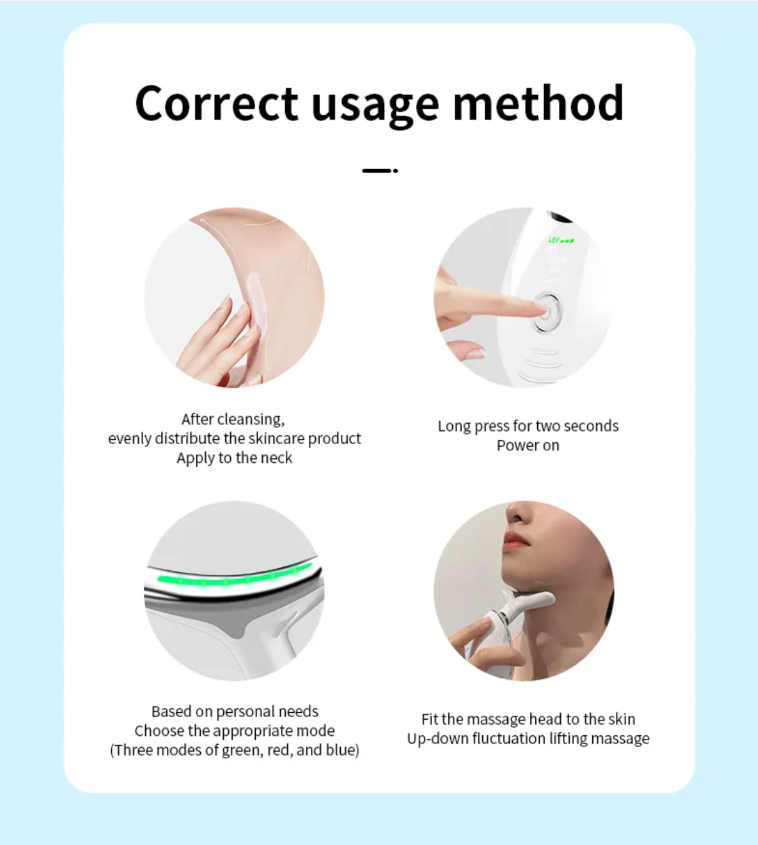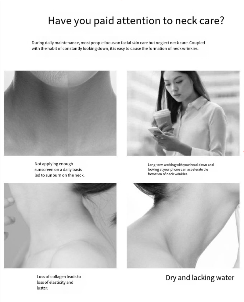 Você ainda está preocupado com as rugas do pescoço por olhar para o telefone ou ficar acordado até tarde? Seu rosto pode ser firme e delicado, mas o simples ato de olhar para baixo faz você parecer cinco anos mais velho? Não deixe seu pescoço se tornar uma falha em sua aparência. Este dispositivo multifuncional de beleza de pescoço usa tecnologia de ponta para resolver com precisão os problemas do pescoço. Apenas 10 minutos por dia irão ajudá-lo a conseguir um pescoço liso e firme!