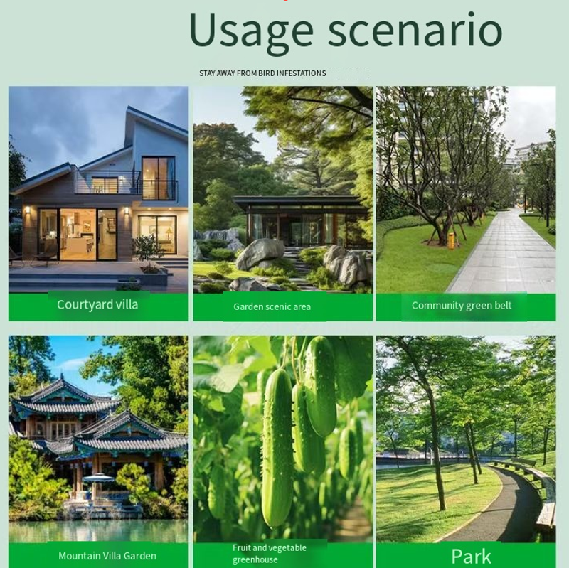 Não deixe que o "banquete da delícia" dos pássaros se transforme no seu "pesadelo de perda". Adquira este repelador de pássaros por voz movido a energia solar, com laser e som formando a "rede repelente de pássaros", proteção completa de 360° para suas conquistas laborais. Diga adeus aos problemas de frutas sendo bicada e colheitas destruídas, permitindo que cada fruto amadureça com segurança e cada colheita seja completa. Seja um "colhedor" seguro!