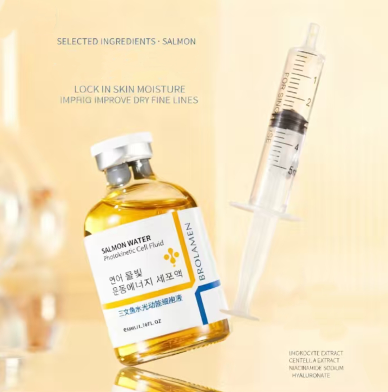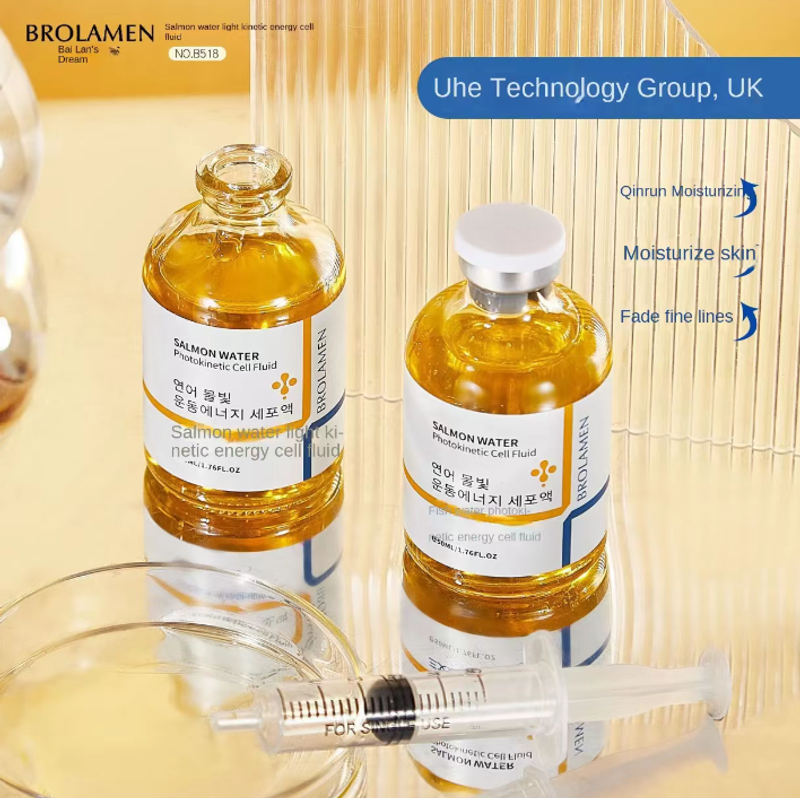 É um produto especialmente desenvolvido pela Uhe Technology no Reino Unido para cinemas. A garrafa dourada contém líquido de célula energética com água e água de salmão – sem precisar ir a um salão de beleza, você pode recriar a experiência de "pele com água brilhante" em casa: Use a seringa correspondente para puxar um tubo e aplique uniformemente no rosto. A textura é como uma essência clara e hidratante de água. Ao espalhá-la, ela é imediatamente absorvida pela pele e não fica nada oleosa.