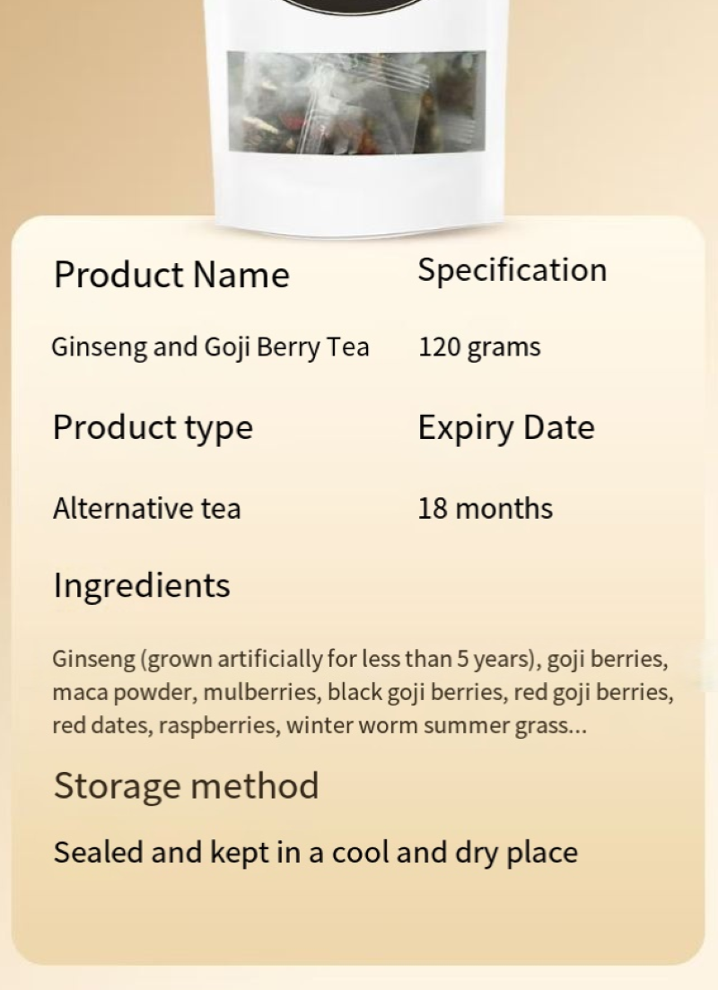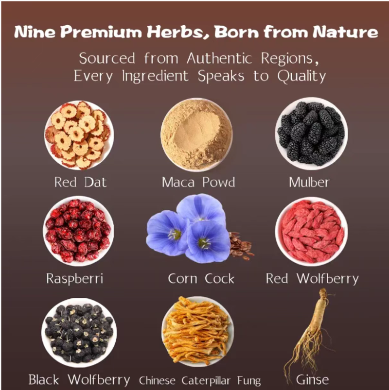 Nove ingredientes, incluindo amora-de-lupa, amoreira, inhame, tâmaras vermelhas, longan, inhame, semente de coix, semente de lótus e alcaçuz, são cuidadosamente selecionados e cada um é escolhido com cuidado: a amoreira nutre os rins e melhora a visão, a amoreira nutre o yin e suplementa o sangue, o inhame tonifica o qi e nutre o yin. Combinado com tâmaras vermelhas e longan para aquecer e fortalecer o corpo. Inhame, semente de coix e semente de lótus nutrem o baço e o estômago, e a semente de lótus acalma o coração e acalma os nervos. O alcaçuz harmoniza todos os sabores e funciona de forma sinérgica, garantindo nutrição sem ficar seco ou gorduroso. É seguro para todas as idades, homens, mulheres e crianças, aproveitarem.