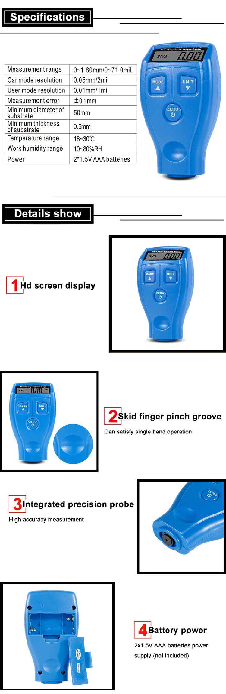 It is specifically designed for measuring the thickness of non-metallic coatings on metal substrates, such as paint and films. The measurement range covers 0 to 1.8mm, with an error of only ±0.1mm, and its accuracy far exceeds the industry average level. Whether it is for quality control of manufacturing products, paint surface inspection in the automotive cleaning industry, coating monitoring in metal processing and chemical industries, or in the field of commodity inspection, it can perform outstandingly.