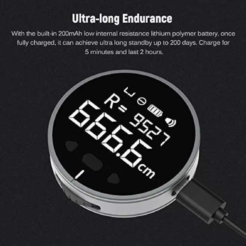 A tela de exibição digital de alta definição combinada com a lógica de operação intuitiva torna os dados claros à primeira vista, com curva de aprendizado zero. É equipado com uma bateria de polímero de lítio de baixa resistência interna de 200mAh, que pode durar até 200 dias em modo de espera. Durante o uso de emergência, uma carga de 5 minutos pode permitir a medição contínua por 2 horas, eliminando completamente a preocupação com a vida útil da bateria. O design compacto permite que ele seja facilmente guardado no bolso e pode ser usado em canteiros de obras, residências e oficinas de artesanato... Você pode medir a qualquer hora e em qualquer lugar.