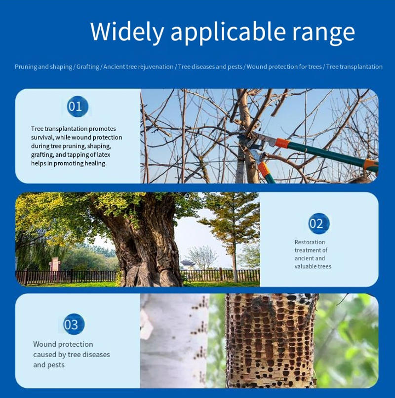 Seu escopo de aplicação é extremamente amplo, abrangendo diversas árvores paisagísticas de jardim, árvores frutíferas e preciosas árvores antigas. Quando usado em transplante de árvores, pode aumentar significativamente a taxa de sobrevivência; Quando usado em poda, modelagem, enxertia, etc., pode promover a cicatrização de feridas e reduzir o risco de infecção; Para o tratamento de rejuvenescimento de árvores antigas e famosas, ela também pode desempenhar um papel importante, ajudando as árvores antigas a recuperar vitalidade.