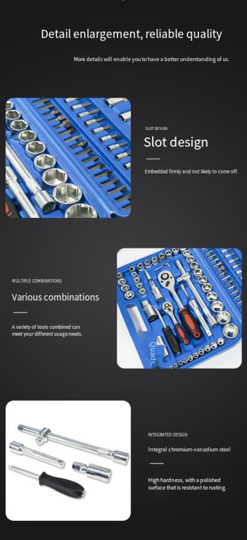 O artesanato e os materiais de nível profissional demonstram qualidade: as ferramentas são forjadas em aço de alto teor de carbono, com a superfície tratada por cromo, resistentes à ferrugem e desgaste, e capazes de manter desempenho estável mesmo expostas a óleo e detritos metálicos por muito tempo; A chave de catraca adota um design de engrenagem preciso, com uma mordida apertada e torque forte, tornando fácil remover parafusos teimosos; A alça ergonômica é antiderrapante e confortável, reduzindo a fadiga das mãos mesmo segurando por muito tempo, tornando as operações de reparo de alta intensidade mais gerenciáveis.