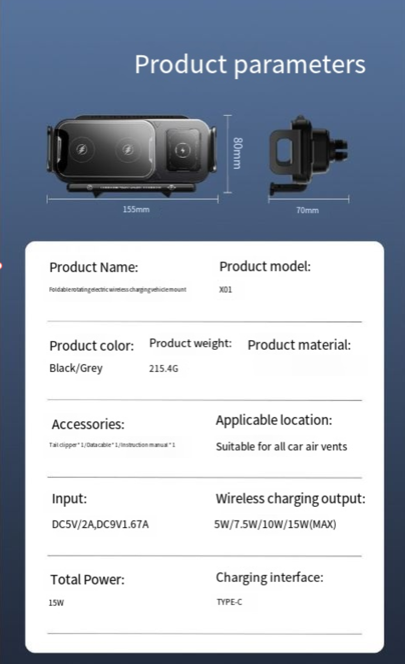 É o "ajudante multifuncional" para cenários. Seja um carro-chefe de tela dobrável para empresários ou um modelo de teste de tela dobrável para entusiastas de tecnologia, ele pode ser perfeitamente compatível. Colocado no console central, pode ser um carregador sem fio e um suporte de navegação, tornando o espaço interno limpo e ordenado e dizendo adeus à bagunça de cabos de dados emaranhados.